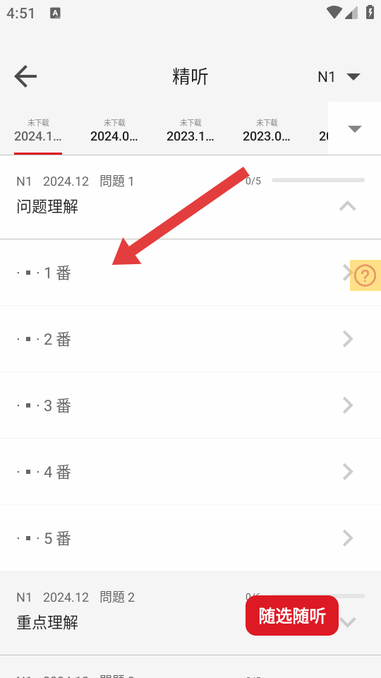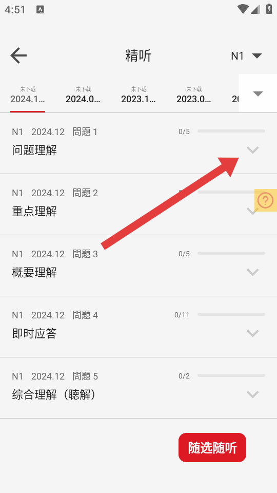 2、在精听题目列表页面,选择要下载音频的听力题目,点击展开箭头。