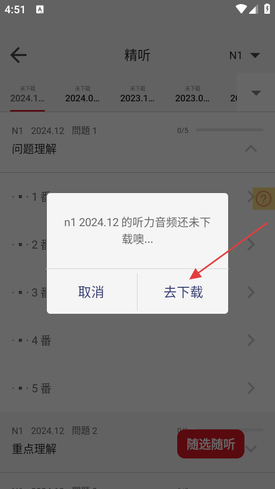 4、在弹出的提示框中,点击去下载,即可开始下载该段听力音频。