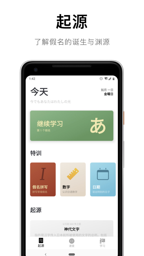 1、在起源点击开始学习按钮进入假名学习模块,支持从第1组假名开始逐步掌握,并可选择特训功能如假名拼写、数字、日期等专项训练,方便针对性提升日语基础。