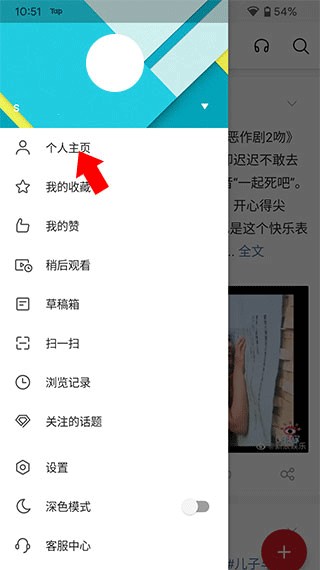 2、在打开的侧边栏界面点击个人主页。