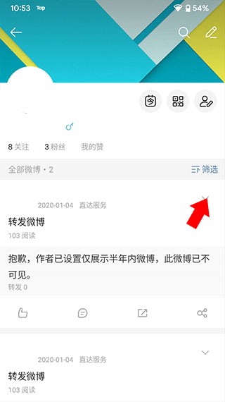 3、然后找到不想让他人看的微博,并点击旁边的下拉箭头。