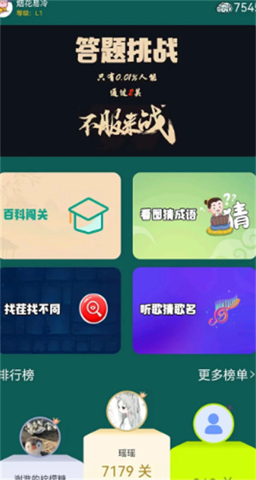 人人答题是一款趣味性十足的学习知识答题挑战类软件,可以为你提供看图猜成语、百科挑战、30秒答题挑战等等多种类型的闯关模式。人人答题里你可以自由选择各种丰富形式的答题模式在答题过程中轻松积累各种知识,提升你的学识。人人答题有着大量关卡等你来解锁挑战,玩法多样答题更是没有限制,既能满足你日常知识的温习需求,也可以在趣味互动中拓展视野、增强思维灵活性,快来人人答题边玩边学吧。