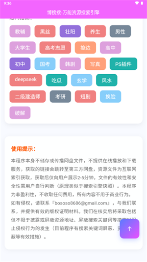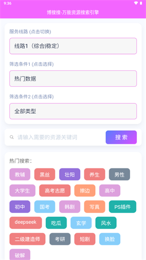 博搜搜是一款高效资源索引与智能推荐的轻量级搜索引擎工具app。不存储任何资源,而是通过实时抓取和筛选互联网内容,快速为用户提供多样化的信息线索。博搜搜设计初衷是帮助用户绕过冗余广告和无效结果,直达高质量内容源头,覆盖学习、娱乐、生活、玄学等多元场景。