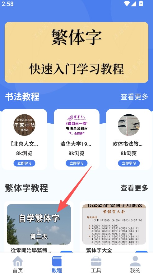 2、点击底部“教程”,进入教程页面,学习书法或繁体字相关教程。