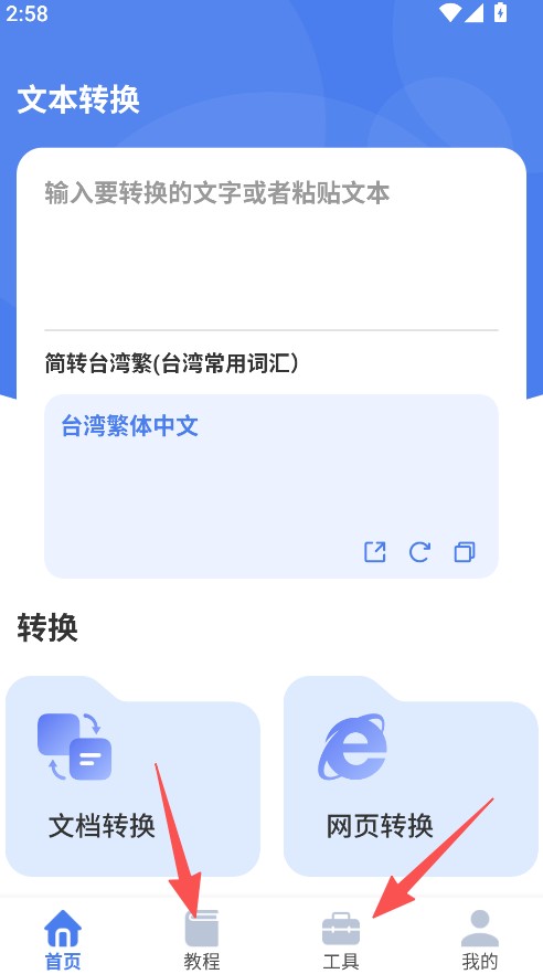 1、点击底部“工具”,可进行文本、文档或网页的繁简转换。