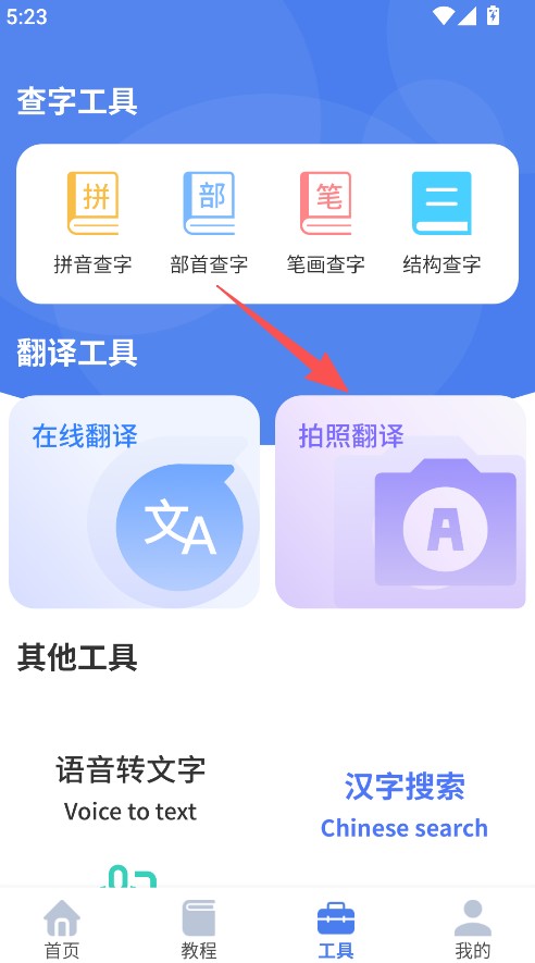3、在“工具”页面,使用拼音查字、拍照翻译等工具,辅助文字查询与翻译。
