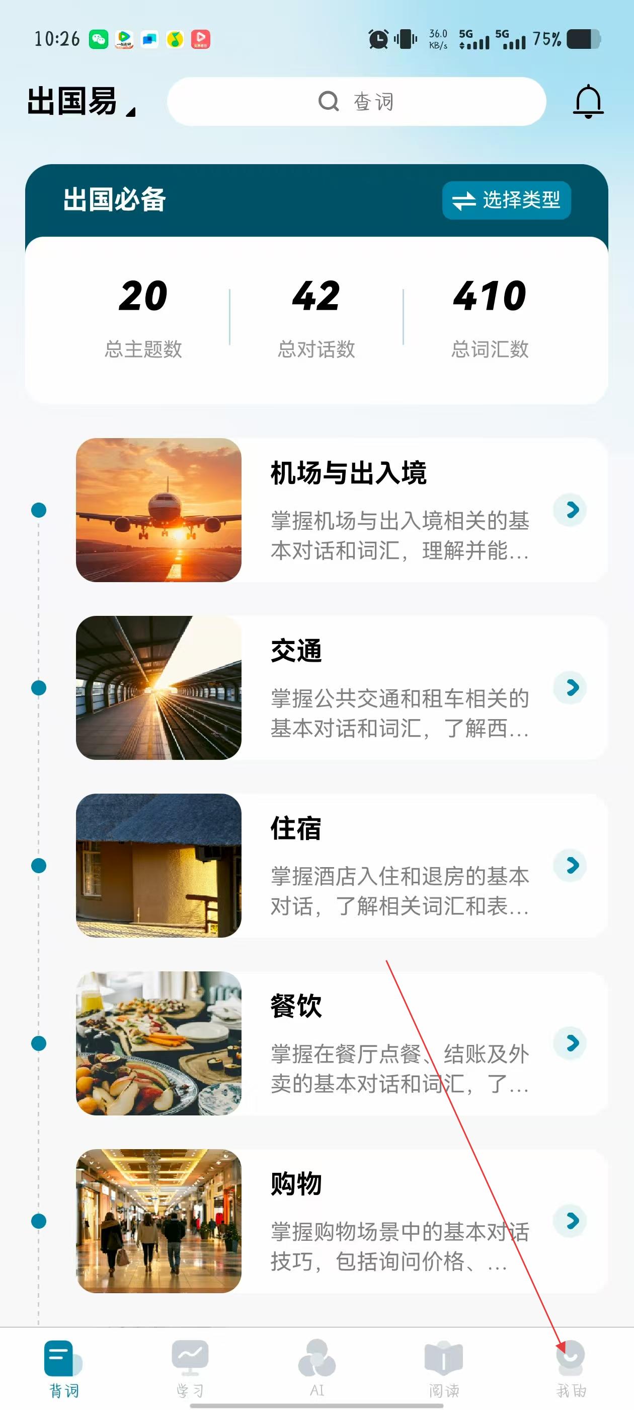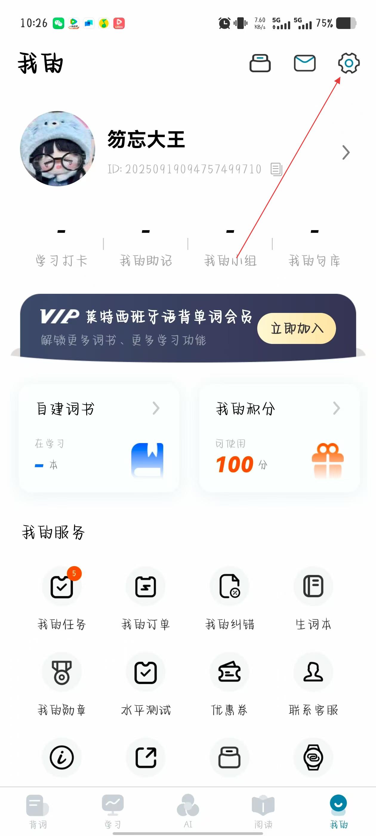 1、打开莱特西班牙语背单词APP,点击底部导航栏最右侧的我的,进入个人页面。