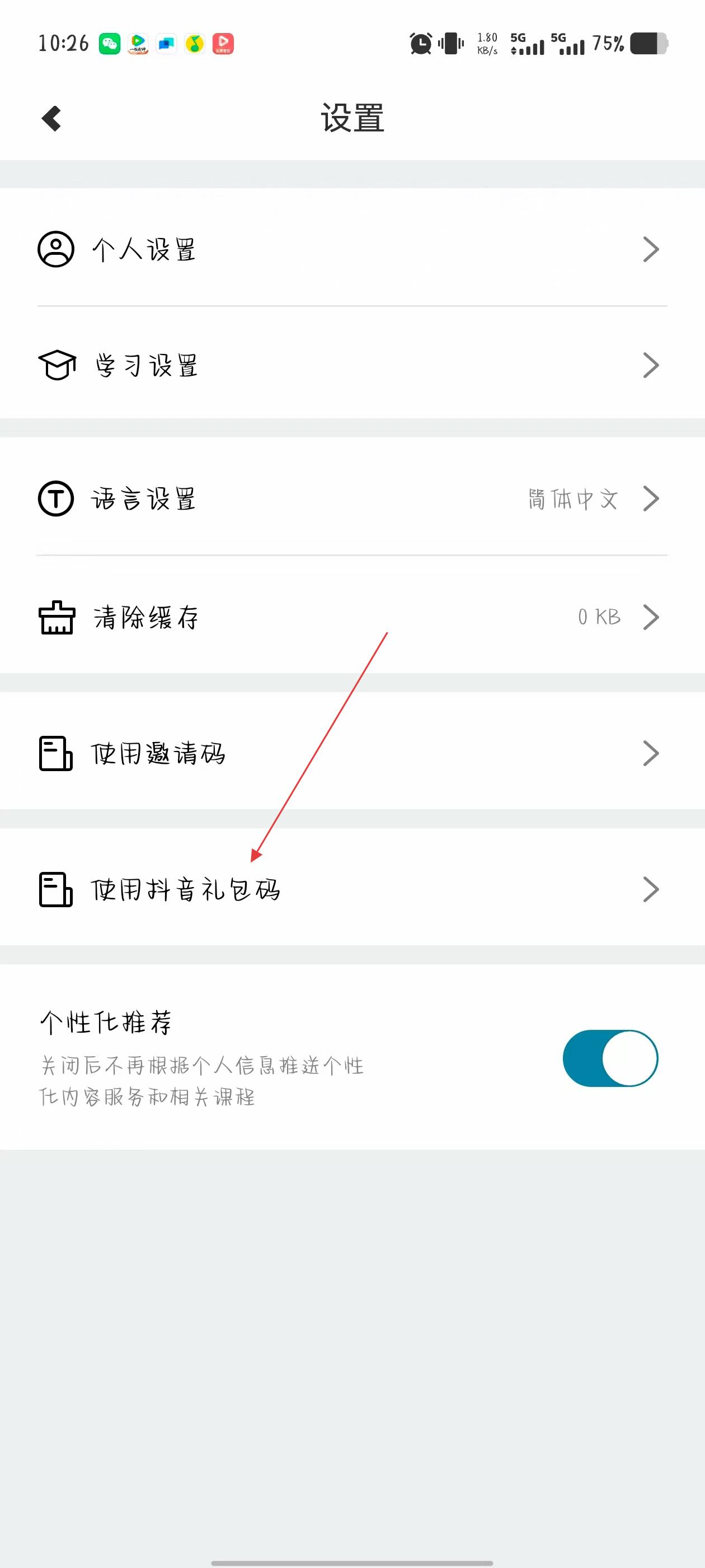 3、在设置界面里,找到使用抖音礼包码选项并点击,进入抖音礼包码输入页面。
