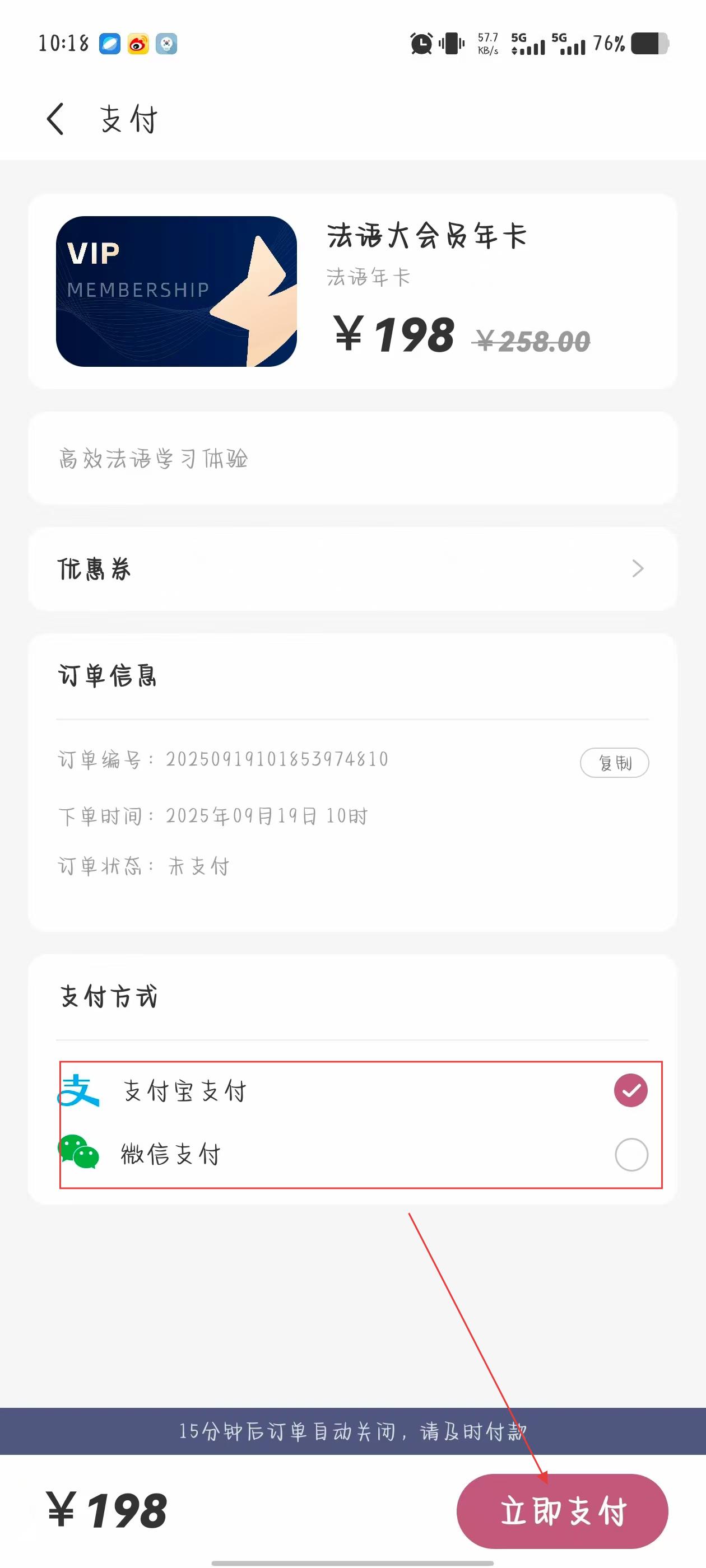 4、进入支付页面后,选择支付方式,确认订单信息无误后,点击立即支付按钮即可开通会员。