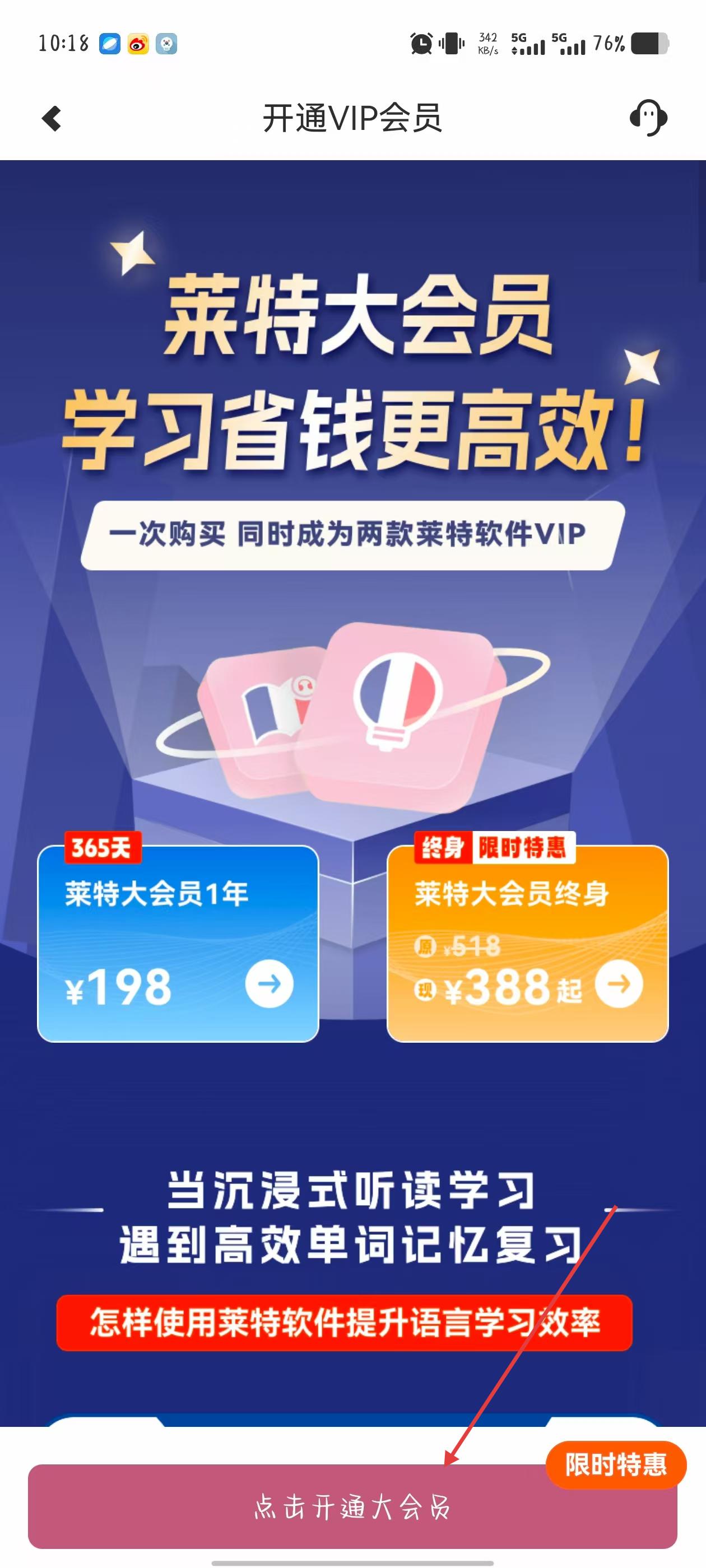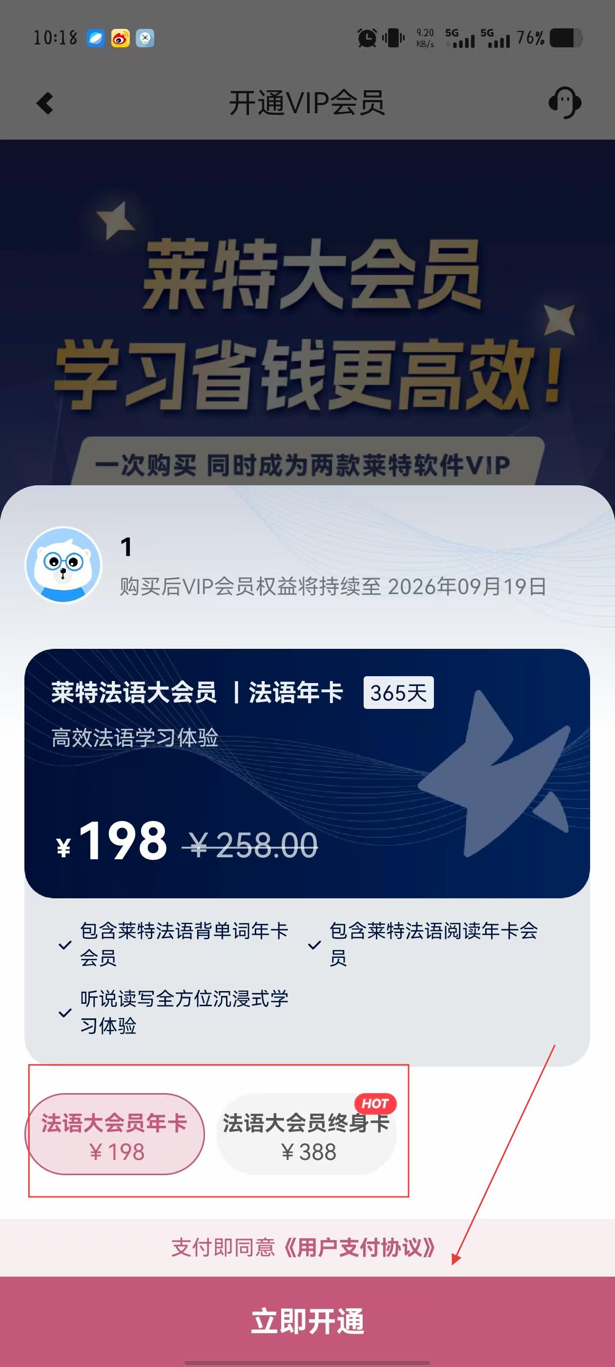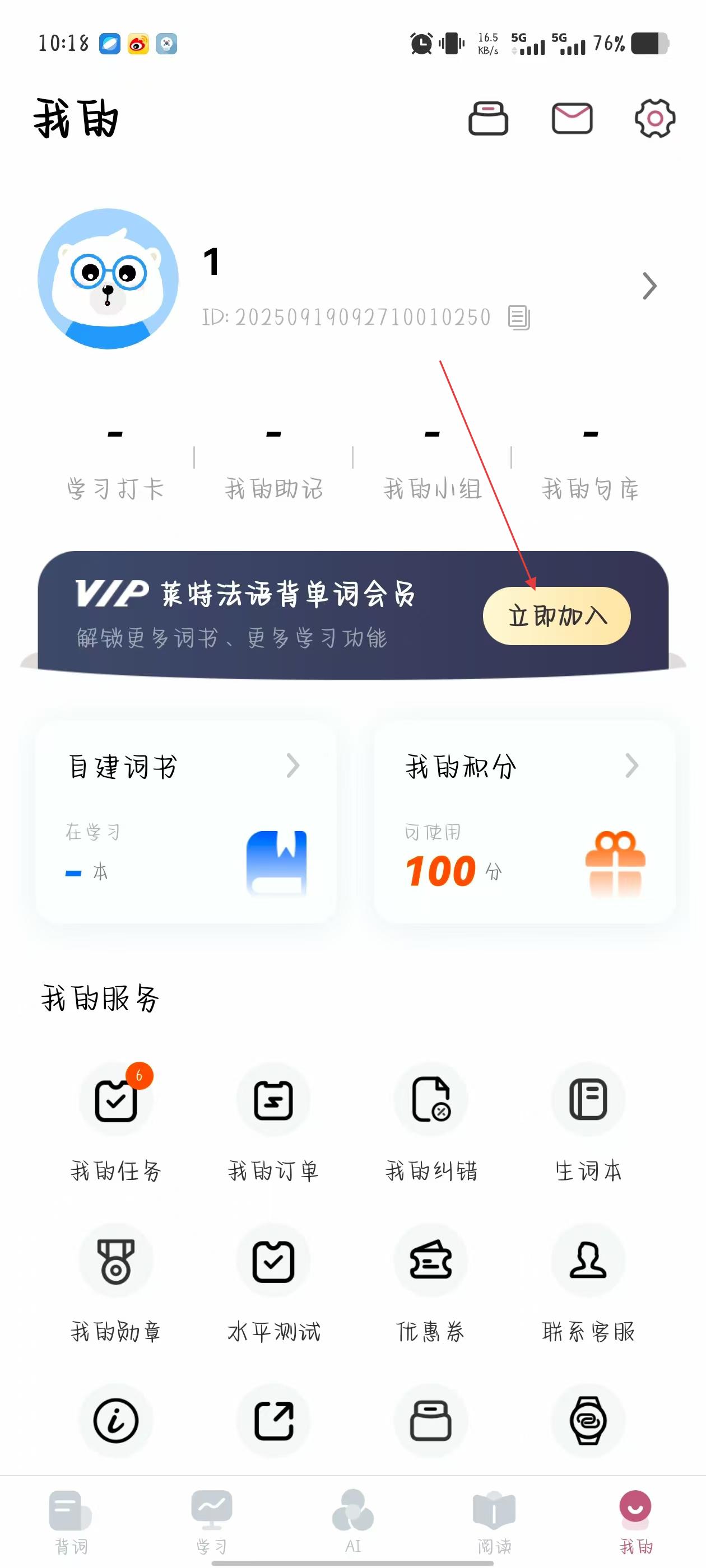 1、打开莱特法语背单词APP,进入个人页面,在页面中找到莱特法语背单词会员区域,点击立即加入按钮。
