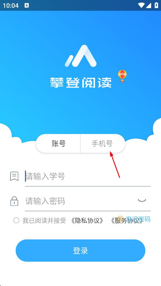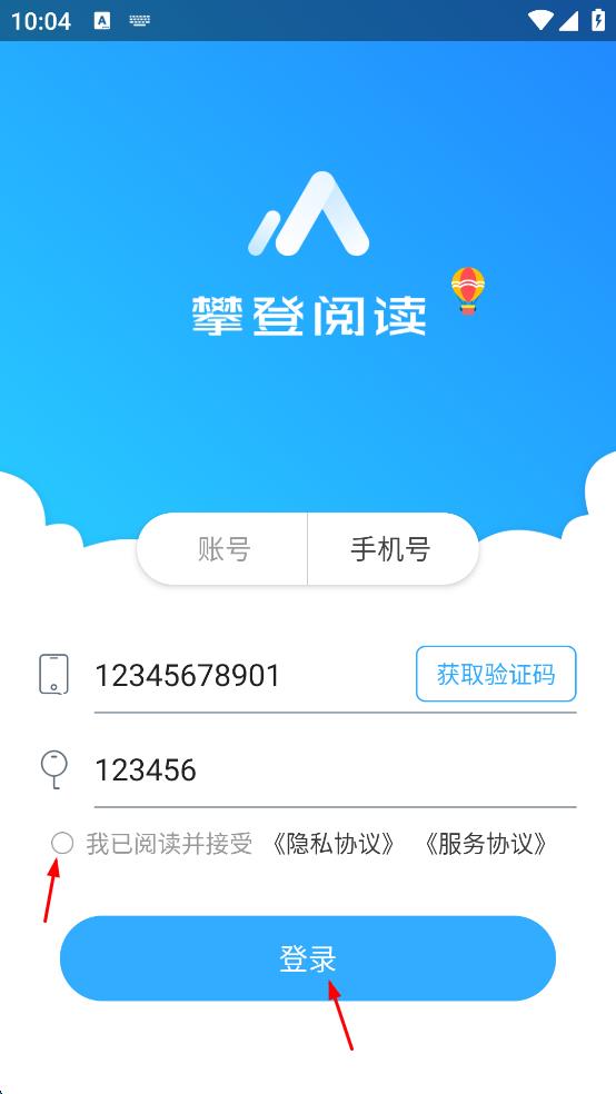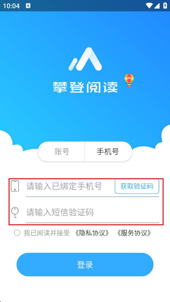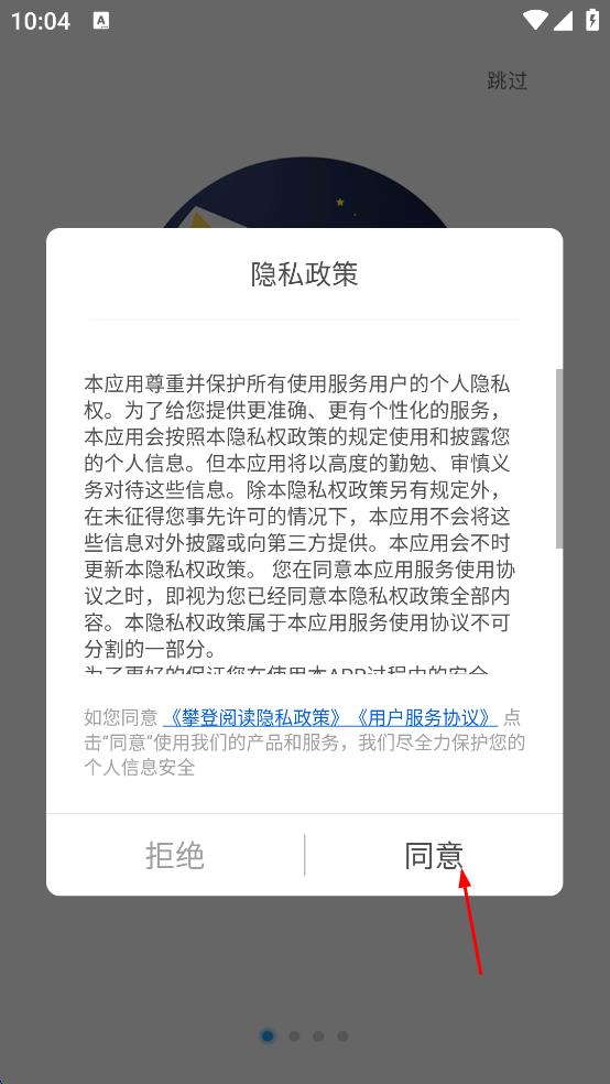 1、打开攀登阅读APP,弹出“隐私政策”窗口,仔细阅读内容后,点击“同意”按钮,进入登录界面。