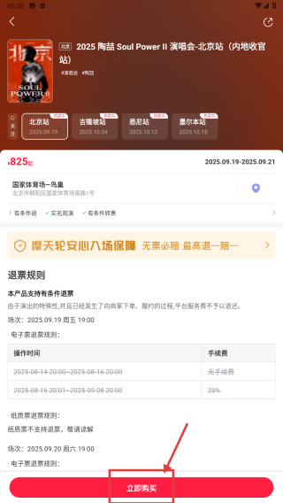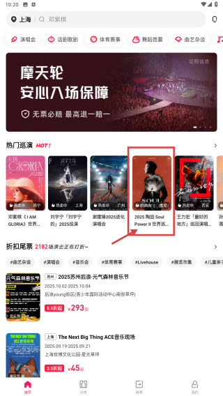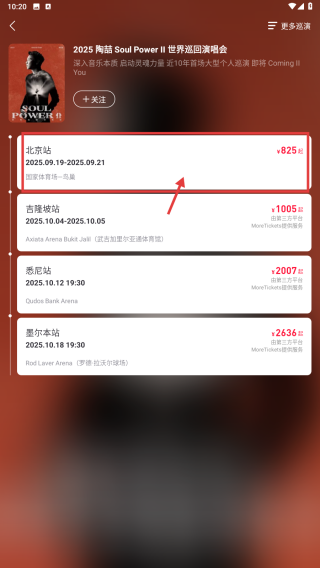 1、打开票务类APP,在首页找到2025 陶喆 Soul-Power-II-世界巡回演唱会并点击,进入演唱会详情页面。