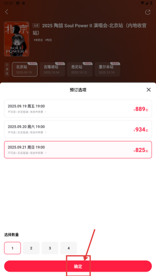 4、在预订选项窗口,选择演出日期和购票数量后,点击确定按钮,完成购票操作。