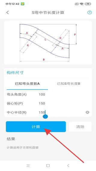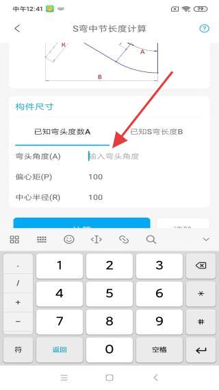 3、进入该页面内,输入弯头角度、偏心距、中心半径。