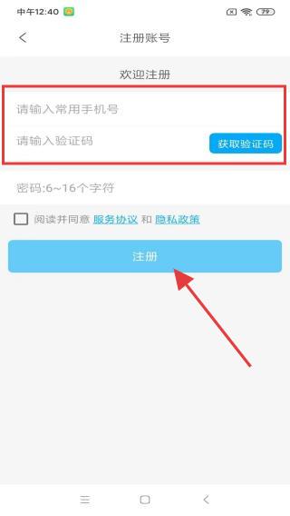 4、在注册账号的页面内,输入注册的收集号和验证码以及密码,再点击注册的按钮。