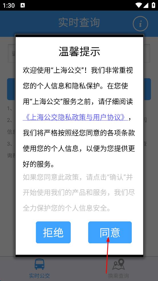 1、打开上海公交app,会弹出温馨提示页面,提示阅读上海公交隐私政策与用户协议,仔细阅读后,若同意,点击“同意”按钮。