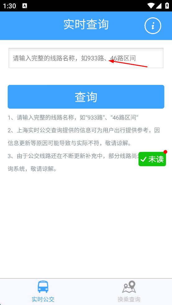 2、进入实时查询页面,看到输入框提示输入完整线路名称,点击输入框,准备输入要查询的公交线路。