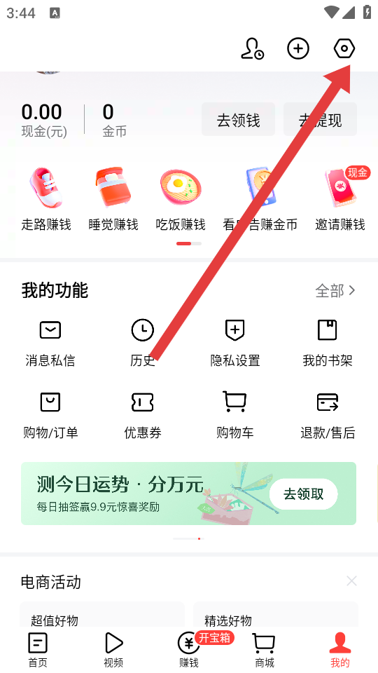 1、进入头条搜索极速版APP后,点击右下角我的页面,点击右上角设置图标,进入设置的界面。