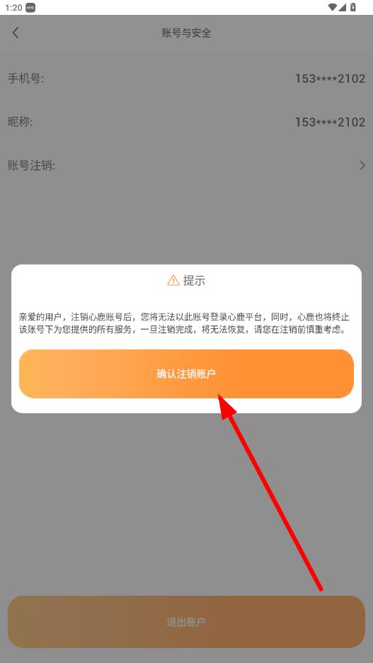 4、在弹出的提示框中,阅读相关提示后,点击确认注销账户,即可完成账号注销。
