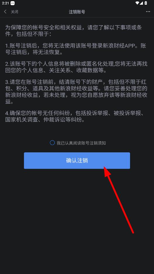 4、仔细阅读注销账号相关须知后,勾选我已认真阅读账号注销须知,再点击确认注销按钮,即可完成账号注销。