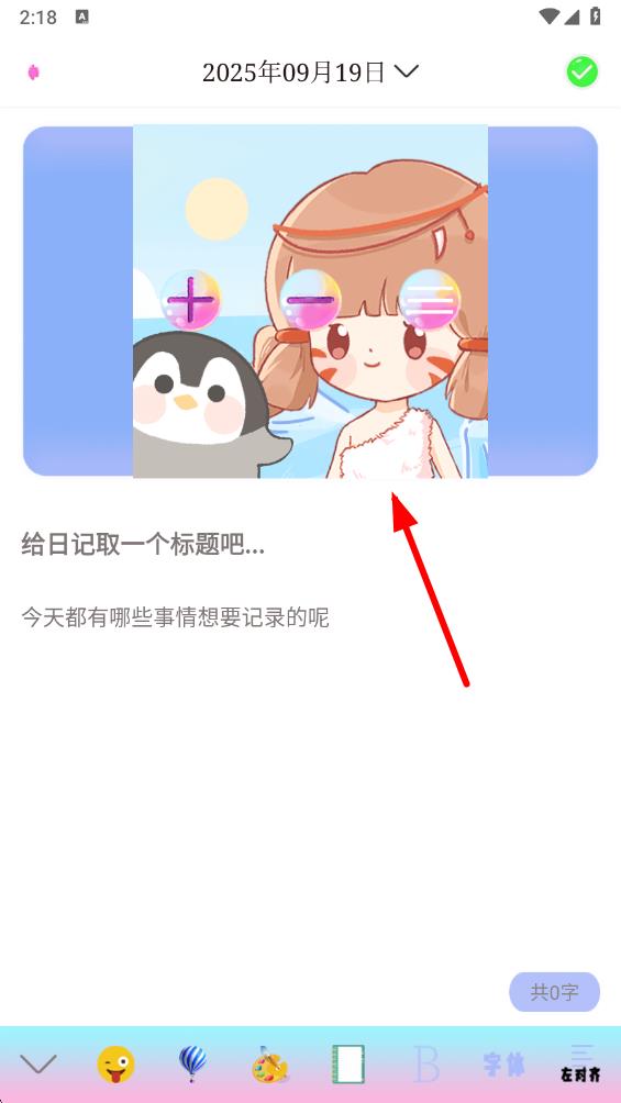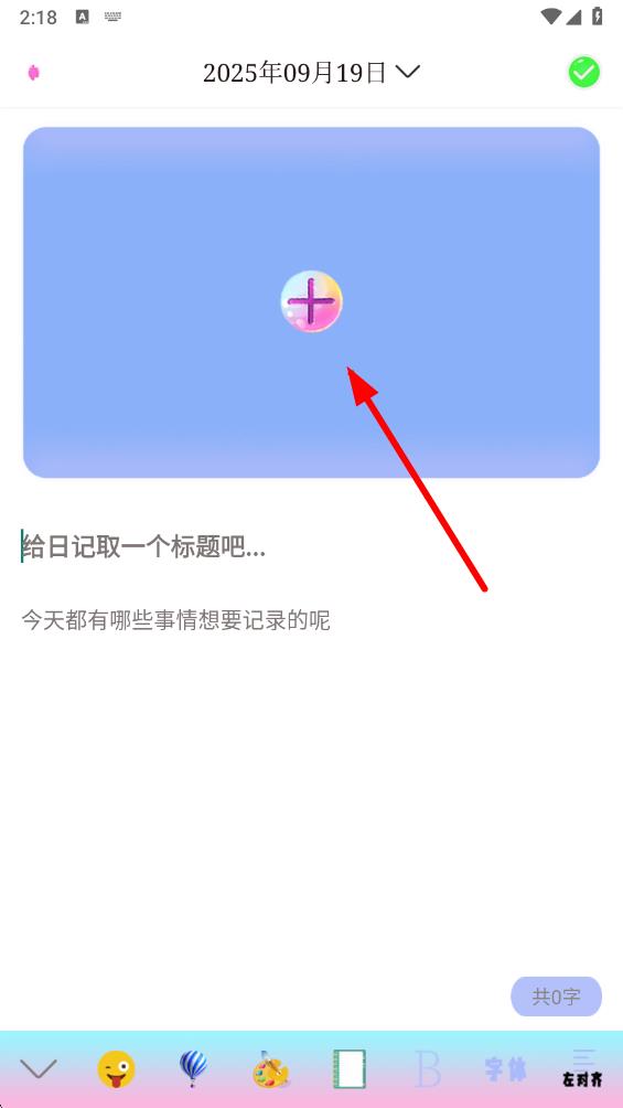 2、在日记编辑页面中,点击加号的圆形图标,调出添加内容选项。