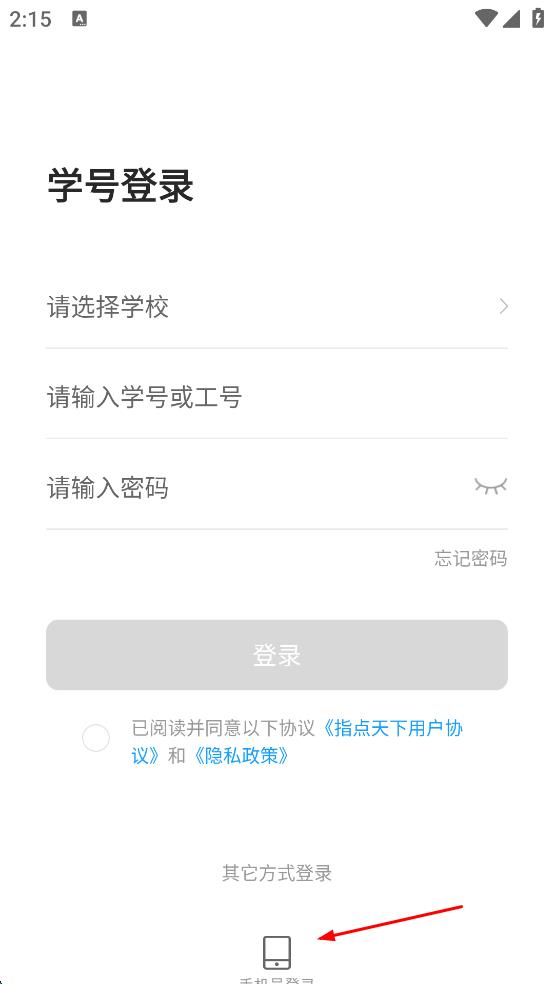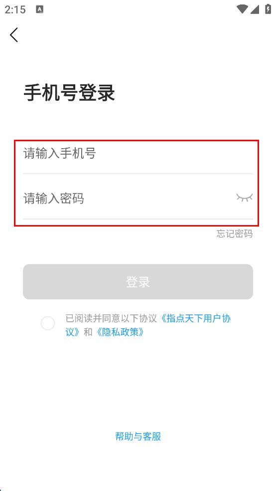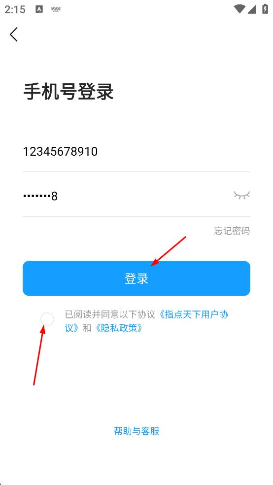 4、填写好手机号和密码后,勾选已阅读并同意以下协议指点天下用户协议和隐私政策选项,然后点击“登录”按钮,即可尝试登录指点天下app。