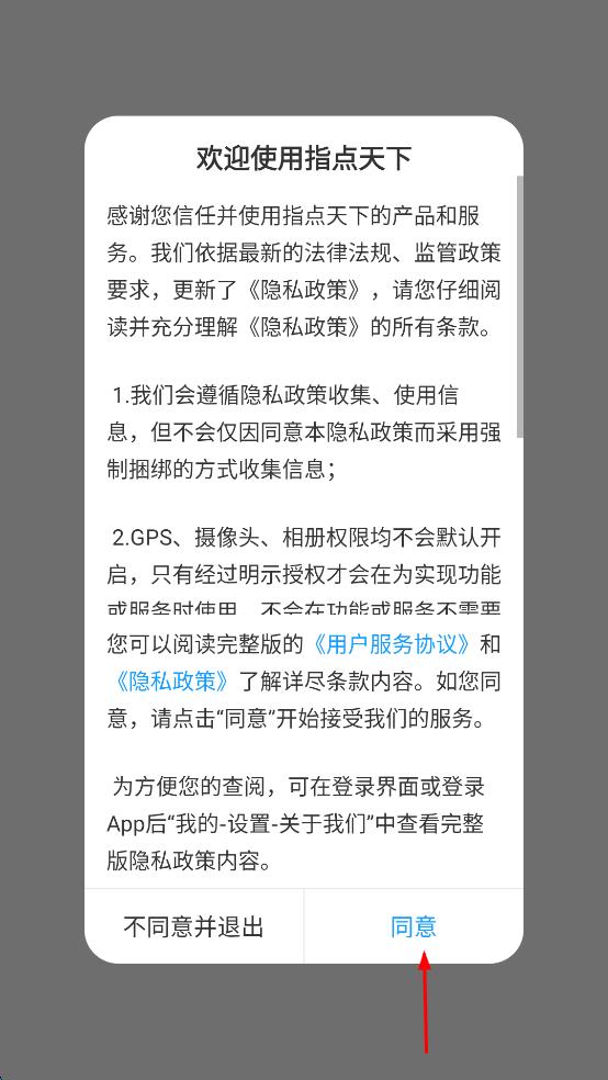 1、打开指点天下app,会弹出欢迎使用提示框,提示阅读隐私政策等内容,仔细阅读后,若同意,点击“同意”按钮。