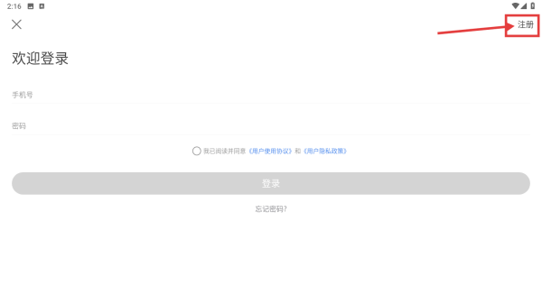 3、在登录注册界面,点击右上角注册选项,进入手机号注册页面。