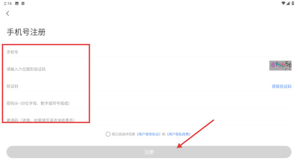 4、在手机号注册页面,输入手机号、图形验证码、短信验证码和密码,勾选协议后点击注册按钮,完成账号注册操作。