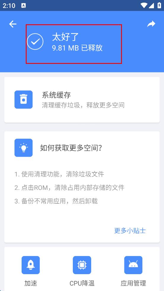 4、清理完成后,页面会提示释放的空间大小,如“9.81MB已释放”,同时还会给出一些获取更多空间的建议,如使用清理功能、清除占用内部存储的文件、备份卸载不常用应用等。
