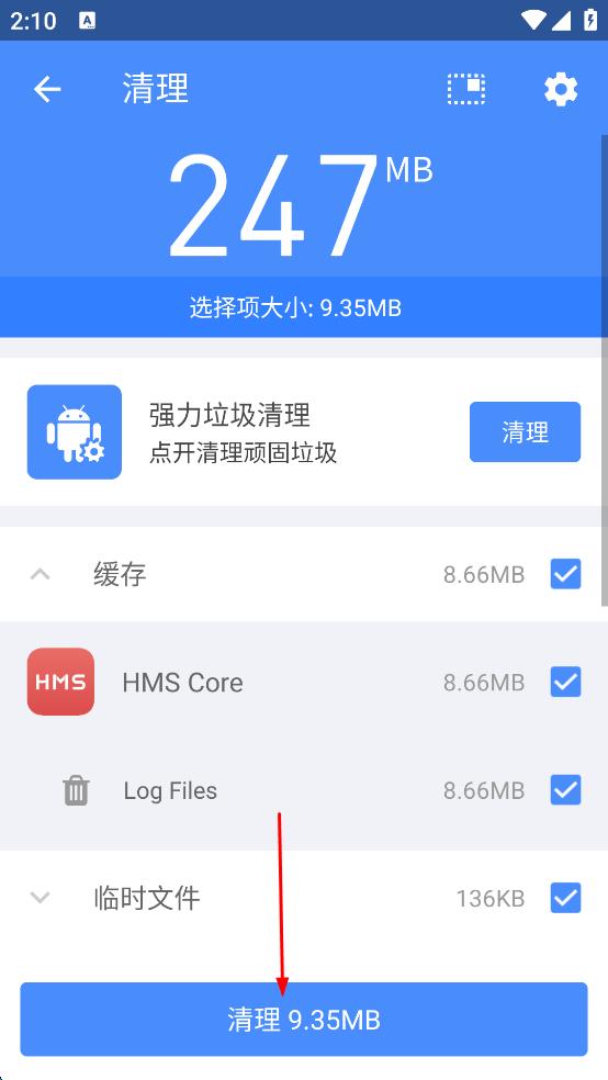 2、进入清理页面,看到可清理的垃圾类型及大小,比如缓存、HMS Core、Log Files、临时文件等,确认要清理的内容。
