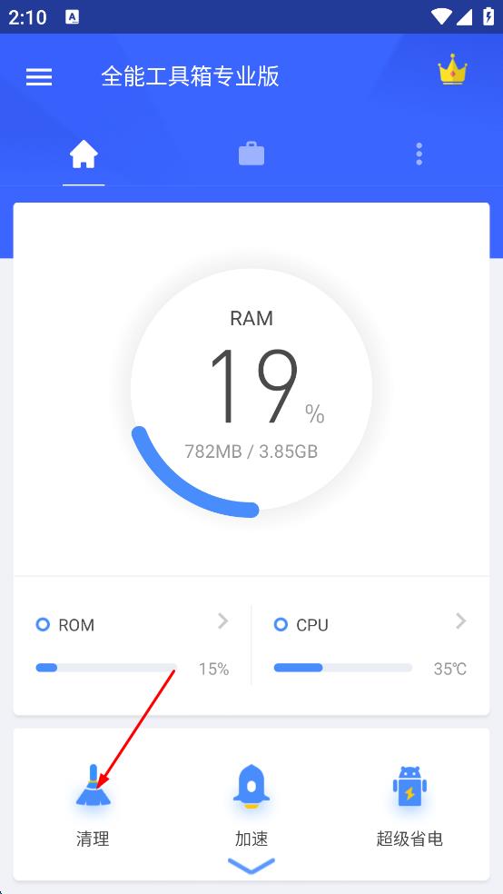 1、打开全能工具箱专业版app,进入主界面后,看到有“RAM”“ROM”“CPU”等显示区域,以及“清理”“加速”“超级省电”等功能选项,点击“清理”选项。