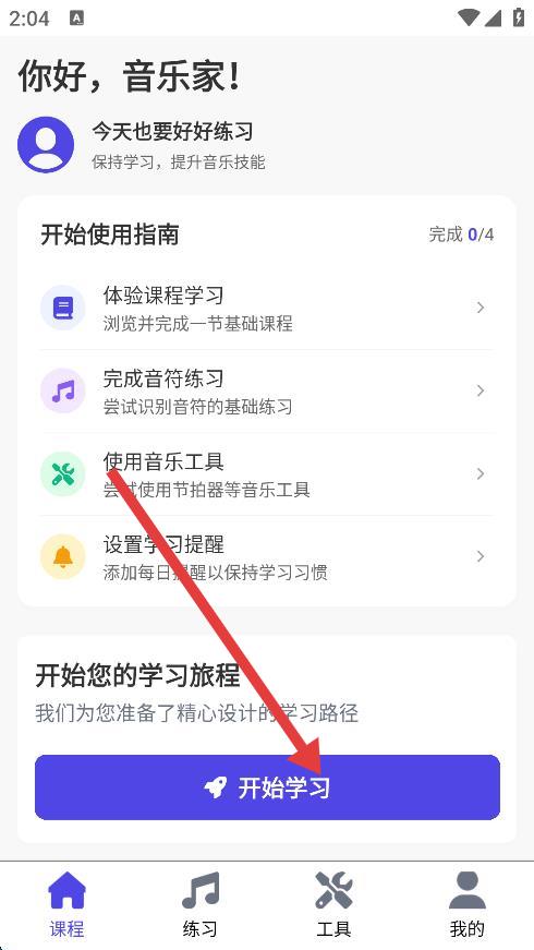 1、打开口袋五线谱App,在主界面点击开始学习按钮。