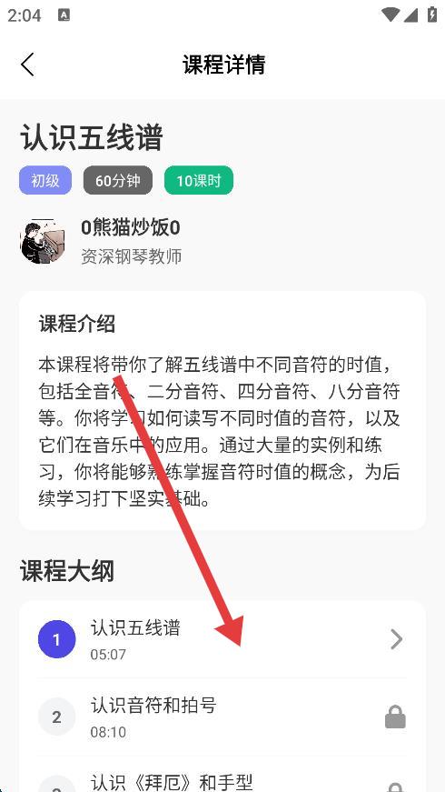 2、进入课程详情页面,选择并点击想要学习的章节。