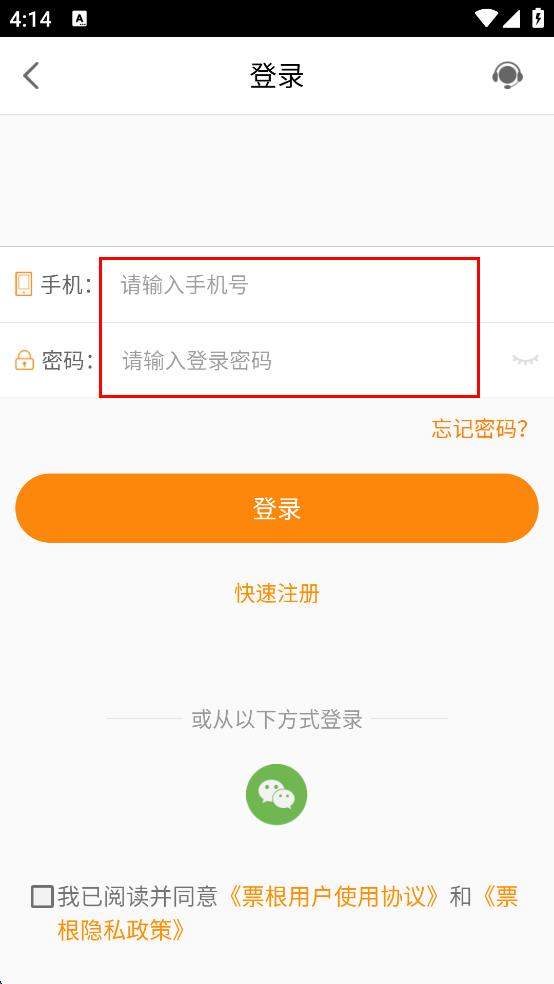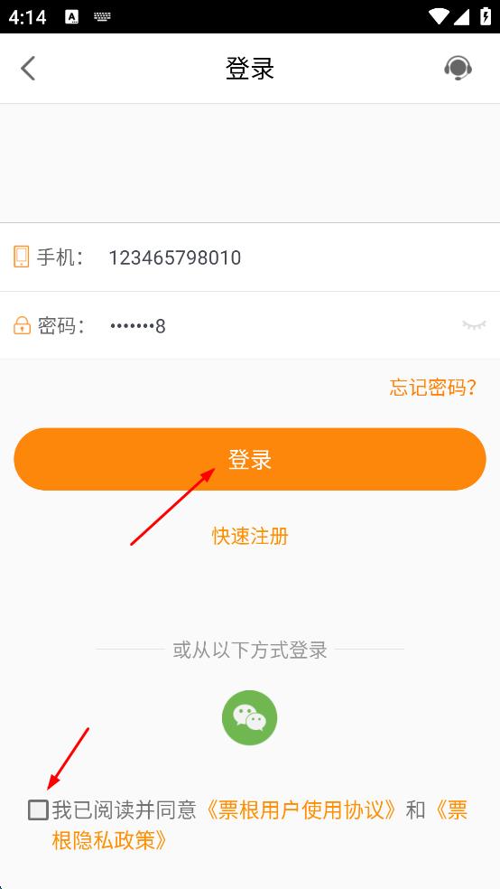 3、在登录页面,先在“手机”输入框中输入手机号码,再在“密码”输入框中输入登录密码,然后勾选“我已阅读并同意票根用户使用协议和票根隐私政策。