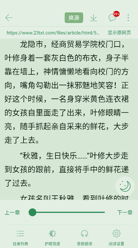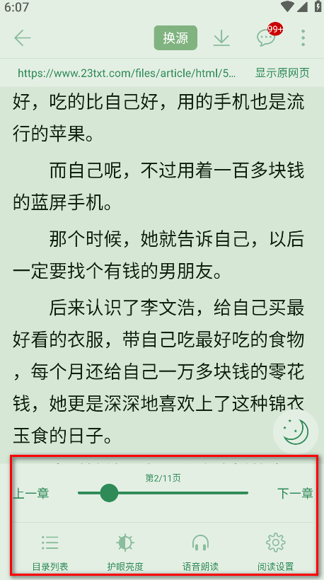 10.点击屏幕,可以看到下方会出现上一章、下一章的翻页功能,还有支持目录列表、护眼亮度、语音朗读、阅读设置等功能。