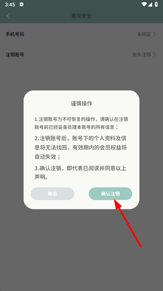 5、在弹出的谨慎操作提示框里点击确认注销,完成账号注销操作。