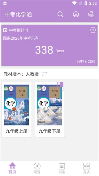 1、打开中考化学通App,在首页可以设置中考倒计时,还能选择人教版九年级上下册化学教材或者通用版,快速进入教材学习。