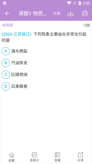 3、选择即可开始答题,在答题界面,底部有收藏、答题卡等功能,方便答题、回顾及分享题目。