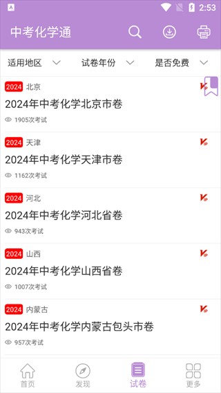 4、切换到【试卷】页,能按地区、年份、是否免费筛选中考试卷,了解各试卷考试次数,按需选择练习。
