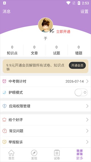 5、进入【更多】个人中心,可查看账号知识点、错题等数据,设置护眼模式,还能开通会员解锁全部资源。