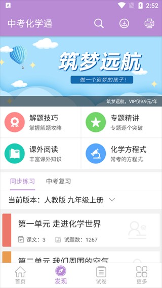 2、进入【发现】板块,有解题技巧、专题精讲等学习模块,可按同步练习或中考复习,针对人教版九年级上册内容,从单元维度开展学习。