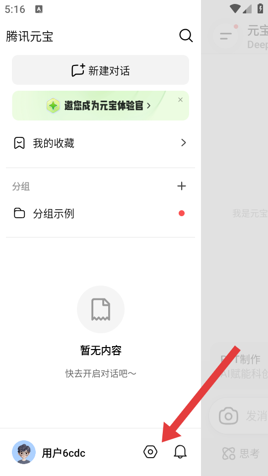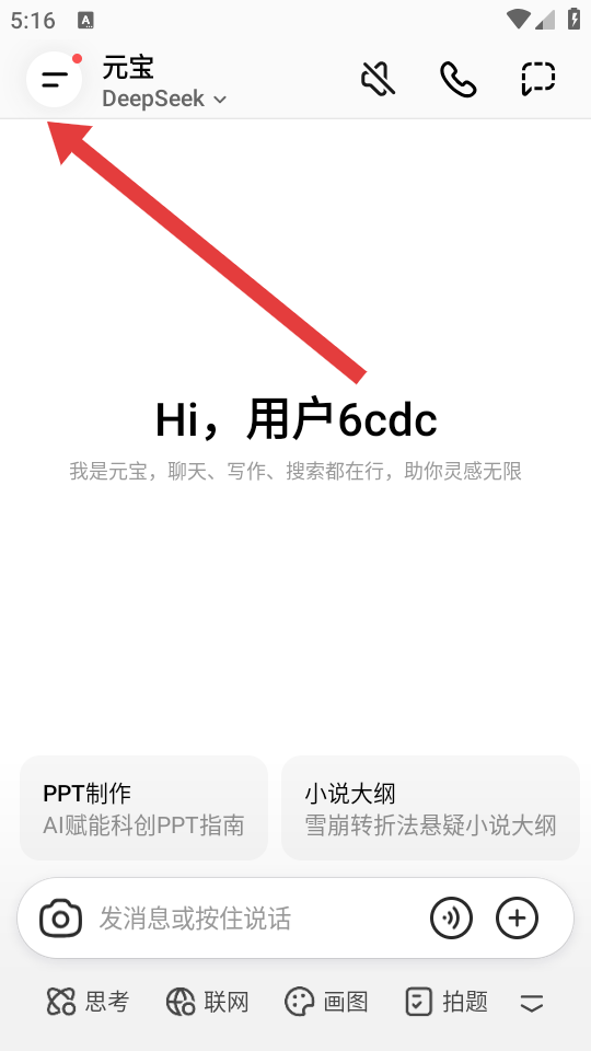 1、打开腾讯元宝APP,点击界面左上角的菜单按钮,展开侧边栏。