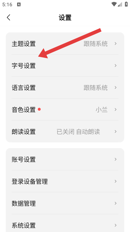 3、在设置的界面里,点击字号设置选项,进入字号设置页面。