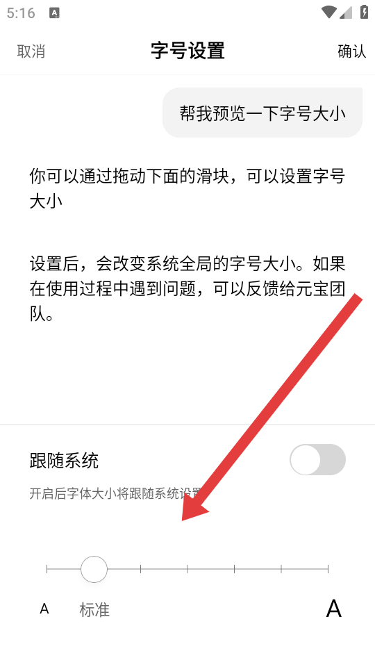 4、在字号设置页面,拖动滑块调整大小,调整后点击确认即可完成设置。