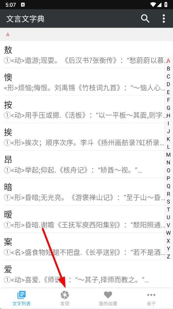 1、打开文言文字典app,点击底部导航栏中的发现选项,进入发现页面。