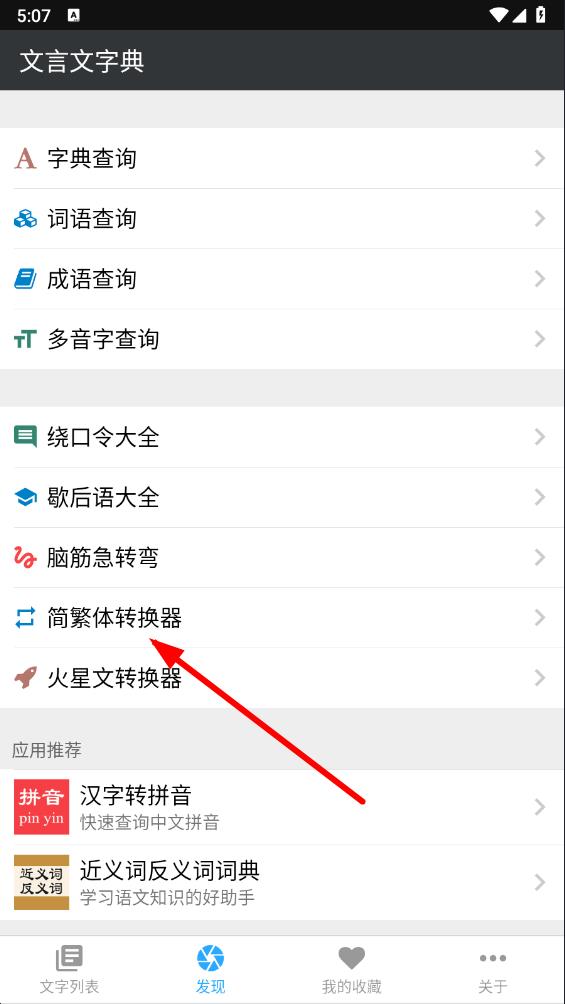 2、在发现页面里,找到并点击简繁体转换器选项,进入简繁体转换界面。