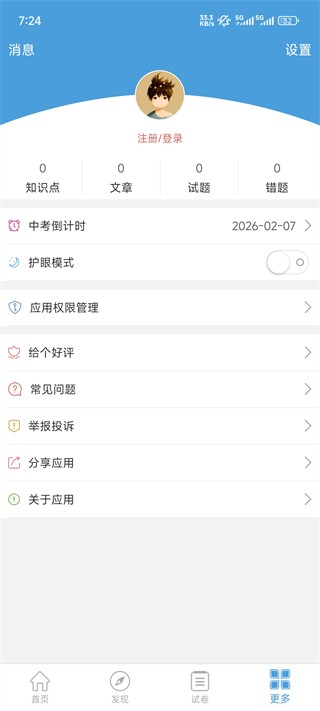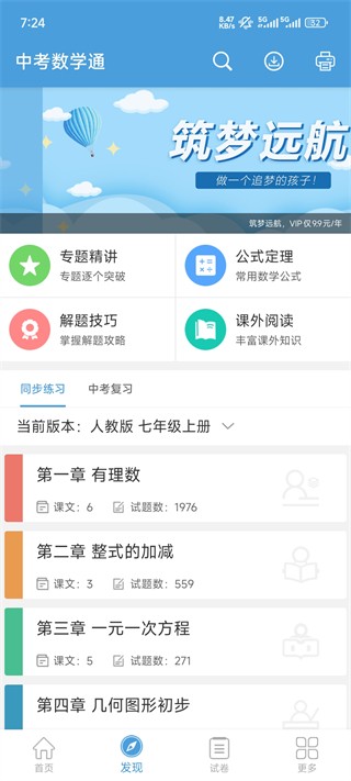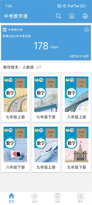 可设置中考倒计时,展示人教版七至九年级数学教材,快速进入教材内容