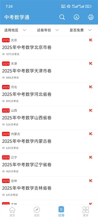 汇总2025年多地区中考数学卷,可按地区、年份及是否免费筛选中考试卷,查看各试卷考试次数并按需练习