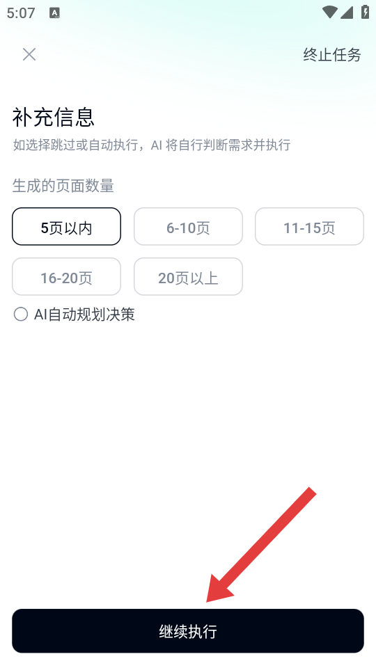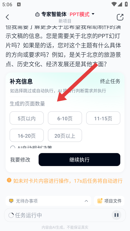 4、在补充内容界面,选择好页数后点击继续执行,即可启动PPT生成流程。
